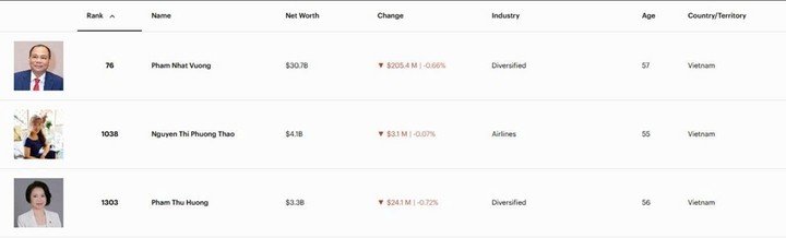 Trong khi đó, tài sản của bà Phạm Thu Hương - Phó Chủ tịch Vingroup, vợ ông Vượng - cũng tăng lên 3,3 tỷ USD, xếp thứ 1.303 thế giới.