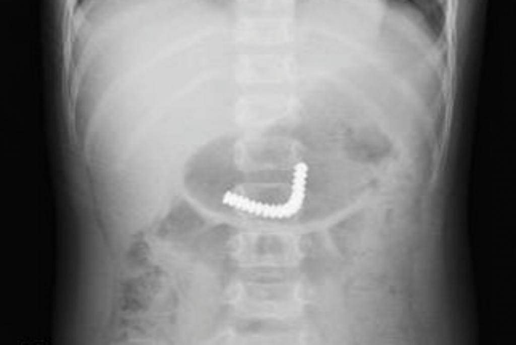 Các bác sĩ cho biết, nuốt dị vật là một tai nạn thường gặp với trẻ nhỏ. Trong nhiều trường hợp, dị vật sẽ trôi ra khỏi cơ thể theo đường đại tiện. Một số tình huống, dị vật này nằm lại trong đường tiêu hóa, gây ra những biến chứng nặng nề như thủng ruột, tắc ruột hoặc có thể nằm ở thanh quản làm tắc đường thở cấp tính.