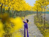 Những cây hoa phong linh nối dài tạo nên không gian như mơ. Sự kết hợp giữa sắc vàng phong linh và không gian thoáng đãng khiến nơi đây trở thành lựa chọn lý tưởng cho những người thích chụp ảnh thiên nhiên lãng mạn. Đây thực sự là "thiên đường" để bạn tạo ra những bức ảnh lưu niệm đầy màu sắc mà không phải đi xa khỏi Hà Nội.