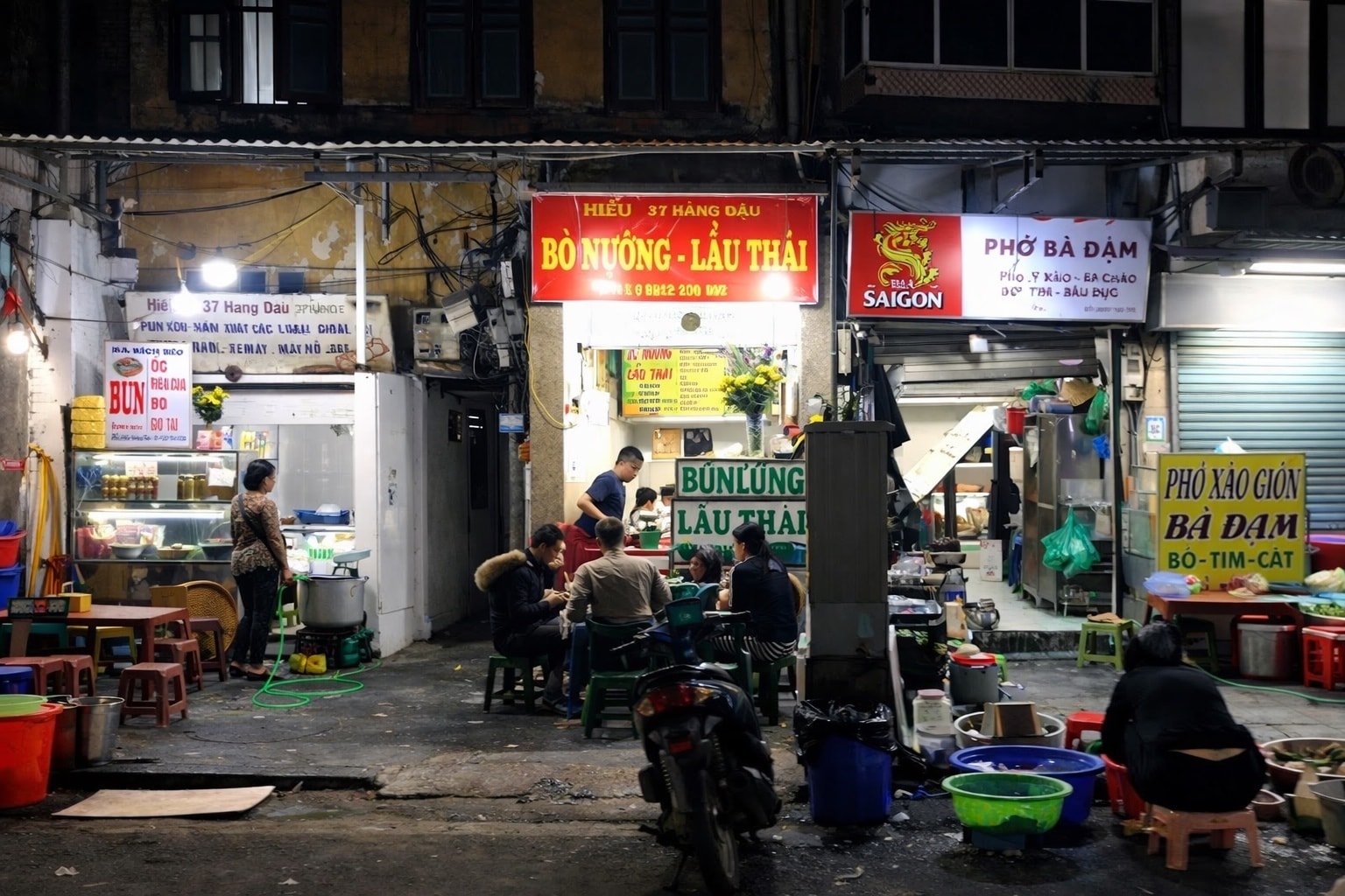 Tình trạng tương tự cũng diễn ra trên phố Hàng Đậu, nơi các quán phở Bà Đạm, bò nướng Cúc Phương, bò nướng lẩu Thái hoạt động nhộn nhịp từ 21h ngày mùng 2 Tết. Vỉa hè nhanh chóng trở thành không gian ẩm thực ngoài trời. Thức ăn chế biến ngay trên nền vỉa hè bụi bặm, rác thải vương vãi. Dù điều kiện tạm bợ, nhiều bạn trẻ vẫn tỏ ra thích thú, ít người quan tâm đến yếu tố an toàn thực phẩm.