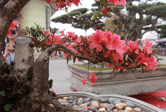 Cây đỗ quyên gần 400 tuổi, đường kính gốc 46cm, dáng cây uốn lượn, hoa nở đỏ rực từ gốc lên ngọn được chào bán với giá 860 triệu đồng tại triển lãm tỉnh Bắc Ninh