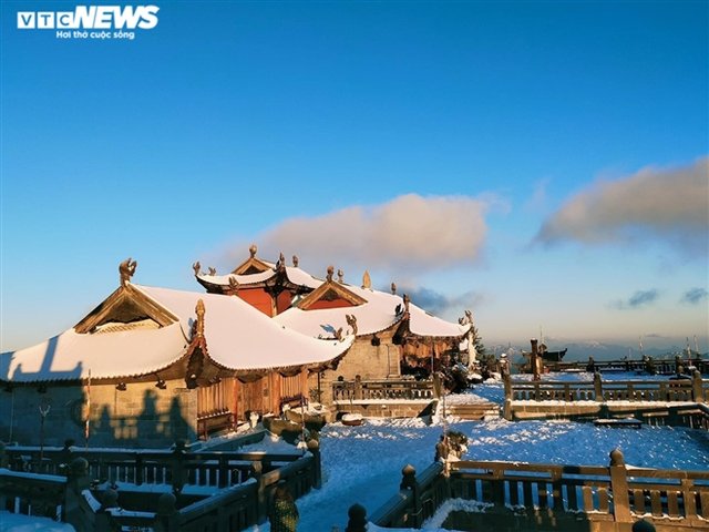 Sáng 29 Tết, lớp tuyết từ hôm qua vẫn phủ trắng trên đỉnh Fansipan, trời trong xanh và có nắng khiến khung cảnh trở nên huyền ảo hơn.