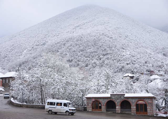 Những thị trấn nằm chênh trên triền núi ở Azerbaijan, Georgia phủ trắng tuyết như biến thành xứ sở cổ tích, khi nhiệt độ mùa này thường xuống mức âm.