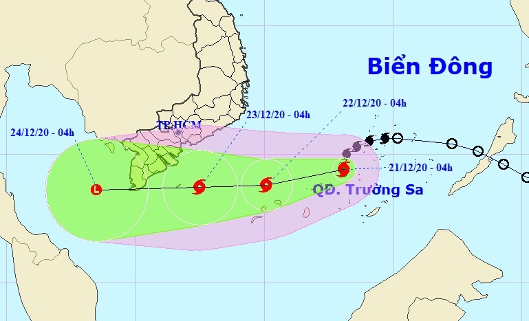 Theo Trung tâm Dự báo Khí tượng Thủy văn Quốc gia, 4h sáng nay, tâm bão cách đảo Huyền Trân (quần đảo Trường Sa) khoảng 280 km về phía đông đông bắc. Gió cấp 8 (60-75 km/giờ), giật cấp 10. Hôm nay, bão đi hướng tây tây nam, tốc độ 10-15 km/h, khả năng mạnh thêm.