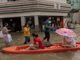 Lực lượng cứu hộ dùng phao hơi để kiểm tra tình hình người dân tại khu vực nước lũ dâng cao. (Ảnh: Getty)