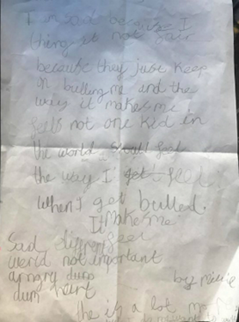 Dòng chữ nguệch ngoạc vì viết vội thể hiện sự hoảng sợ tột độ của cô bé tiểu học: "Không đứa trẻ nào trên thế giới này nên chịu cảm giác mà con phải trải qua khi bị bắt nạt. Điều đó làm con buồn, cảm thấy khác biệt, kỳ quặc, không quan trọng, giận dữ, ngu xuẩn và tổn thương. Còn nhiều nữa nhưng con không muốn viết ra". Lời kêu cứu tuyệt vọng "Làm ơn giúp con ngừng việc bị bắt nạt" khiến Naomi không khỏi đau lòng.