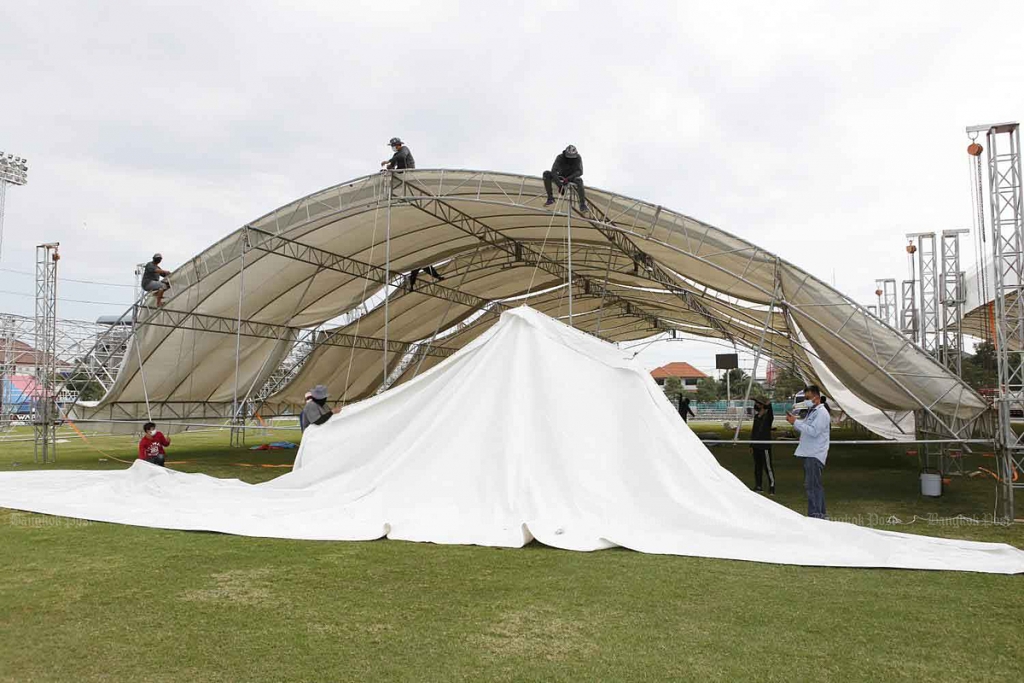 Bệnh viện dã chiến được dựng tại sân vận động Samut Sakhon. Ảnh: Bangkok Post |