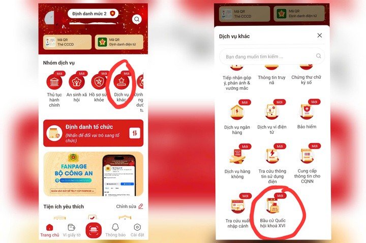 Bước 1: Đối với cử tri đã có tài khoản định danh điện tử mức 2 truy cập ứng dụng VNeID trên điện thoại thông minh, chọn mục Dịch vụ khác → Bầu cử Quốc hội khóa XVI → Khu vực bỏ phiếu của cử tri → Chọn Thay đổi nếu muốn yêu cầu thay đổi khu vực bỏ phiếu. Chọn địa điểm muốn tham gia bỏ phiếu.