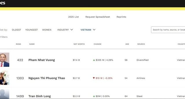 Việt Nam còn 5 đại diện trong danh sách tỷ phú thế giới năm 2025 của Forbes sau khi Chủ tịch Thaco Trần Bá Dương rời danh sách.