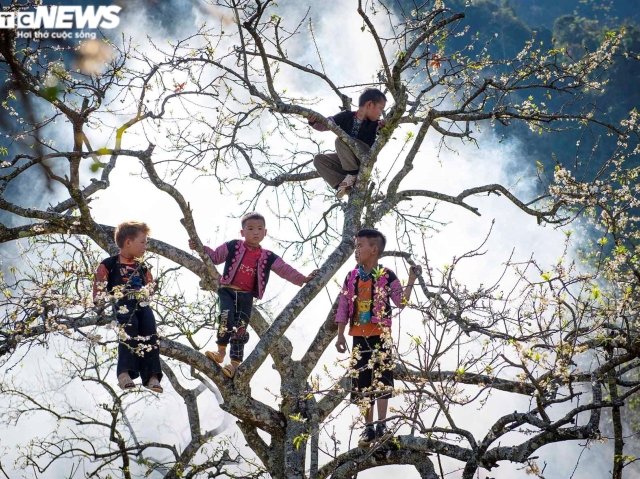 Ảnh: Trẻ em vùng cao vui đùa giữa rừng hoa mận trắng xoá