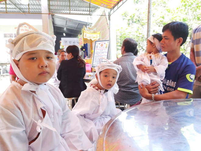 Ngồi kế ông Mạnh là 3 đứa cháu ngoại đang vấn khan tang trên đầu. Ông Mạnh cho biết đó là 3 đứa con chị Thu. Bé Nhớ thất thần nói rằng rất nhớ cha mẹ. “Nhưng cha mẹ con chết rồi chú ơi”, Nhớ nói trong nước mắt.