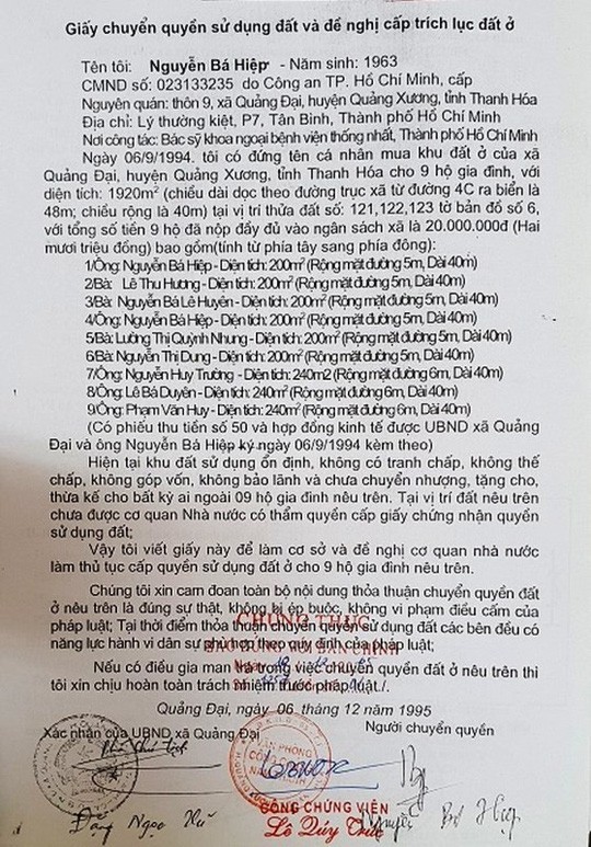 Đến ngày 6-12-1995, ông Đặng Ngọc Vũ, Phó Chủ tịch UBND xã Quảng Đại (hiện là Bí thư Đảng ủy xã Quảng Hùng, TP Sầm Sơn), ký xác nhận chuyển quyền sử dụng đất và đề nghị cấp trích lục đất cho ông Nguyễn Bá Hiệp và 8 người thân của ông Hiệp. Từ cơ sở đó, ngày 14-12-2015, ông Hiệp và 8 người thân đã được UBND huyện Quảng Xương cấp 9 giấy chứng nhận quyền sử dụng đất (GCNQSDĐ).