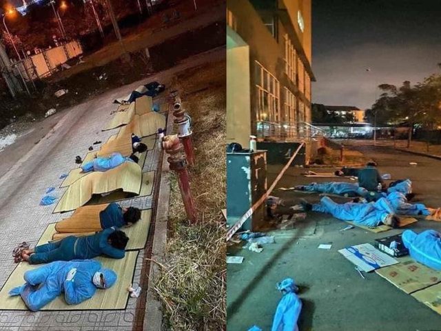 "Anh hùng thầm lặng" ăn cơm hộp ở lề đường sân bay