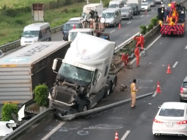 Đang kéo rơ-mooc chở container loại 40 feet trên cao tốc TP Hồ Chí Minh-Trung Lương thì xe đầu kéo gặp sự cố tông vào dải phân cách khiến container rơi văng khỏi rơ-mooc chắn ngang một chiều cao tốc, trụ đèn chiếu sáng cũng bị ngã chắn ngang chiều ngược lại…