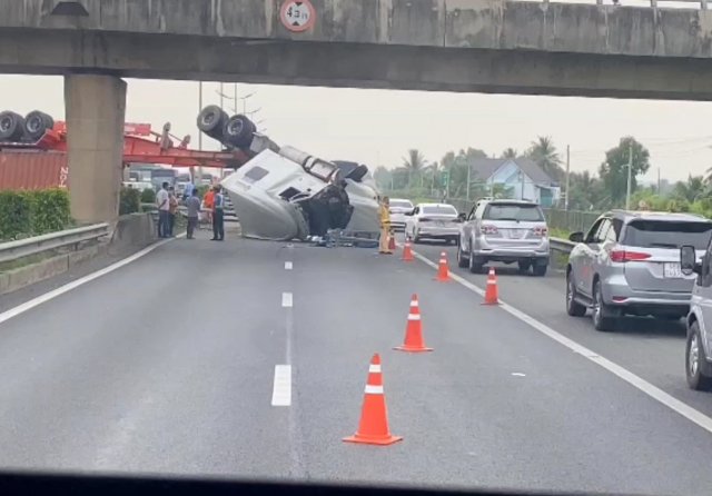Chiếc xe đầu kéo mất kiểm soát tông ngã trụ đèn chiếu sáng và hàng loạt dải ta-luy rồi lật ngửa trên đường cao tốc thành phố Hồ Chí Minh - Trung Lương.