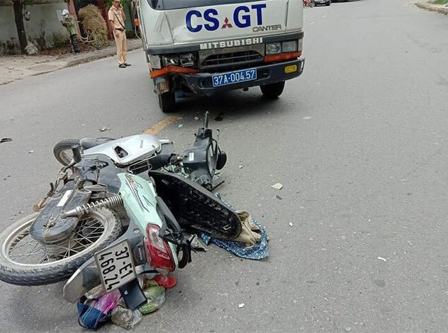 Chị Nguyệt lái xe máy chở con gái trên quốc lộ 46B, đoạn qua thị trấn Dùng, đã va chạm với xe của đội CSGT huyện Thanh Chương đi chiều ngược lại.