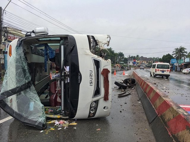 Xe khách loại 29 chỗ chở theo hàng chục hành khách bất ngờ tông vào dải phân cách rồi lật ngang giữa đường, sự việc khiến nhiều người bị thương.