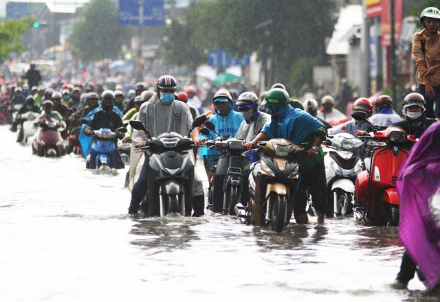 Cơn mưa lớn kéo dài trên địa bàn tỉnh Bình Dương khiến cho Quốc lộ 13 đoạn qua thị xã Thuận An ngập nặng, hàng ngàn phương tiện 'chìm sâu' trong nước.