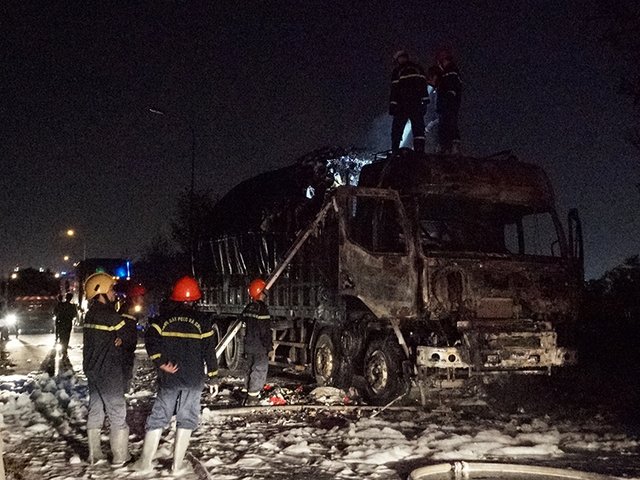 Xe tải bất ngờ cháy, tài xế Đoàn Văn Toàn nỗ lực dập lửa nhưng bất thành; đường vào cảng Cát Lái (quận 2) ùn ứ nghiêm trọng.