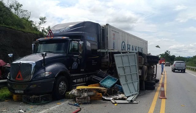 Xe tải biển số 88C-10.009 đâm vào xe khách chạy hướng Lào Cai - Nội Bài, sau đó đâm tiếp vào xe container trong vụ tai nạn liên hoàn trên cao tốc Nội Bài - Lào Cai xảy ra trưa 5.7, làm 3 người bị thương.