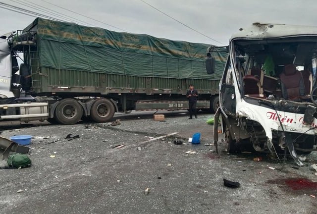 Chiếc xe khách đang chạy trên quốc lộ 1 qua tỉnh Khánh Hòa thì va chạm liên tiếp với 2 chiếc xe tải khiến 1 người chết, 12 người bị thương.
