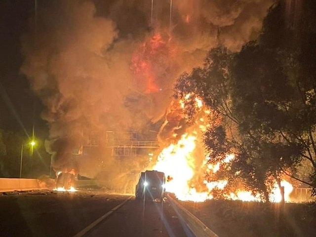 Chiếc xe bồn nghi chở xăng dầu đang lưu thông trên cao tốc Hà Nội- Hải Phòng thì va chạm với 1 ô tô khác rồi bốc cháy dữ dội.
