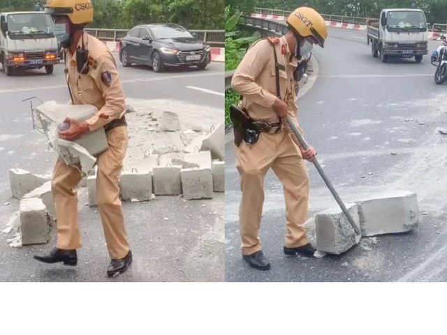 Cơ quan chức năng truy tìm chiếc xe làm rơi hàng chục khối bê tông trên đường dẫn từ Quốc lộ 1B xuống Quốc lộ 5 (phường Thạch Bàn, quận Long Biên, Hà Nội).
