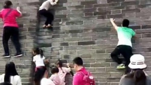 Khách Trung Quốc cho con tay không leo tường cổ cao 60 m