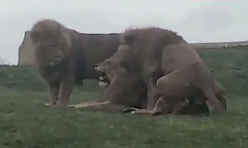 Một khách tham quan ghi lại khoảnh khắc ba con sư tử đực trông như đang giao phối chỉ cách đầu xe khoảng 10 mét trong công viên Anh.