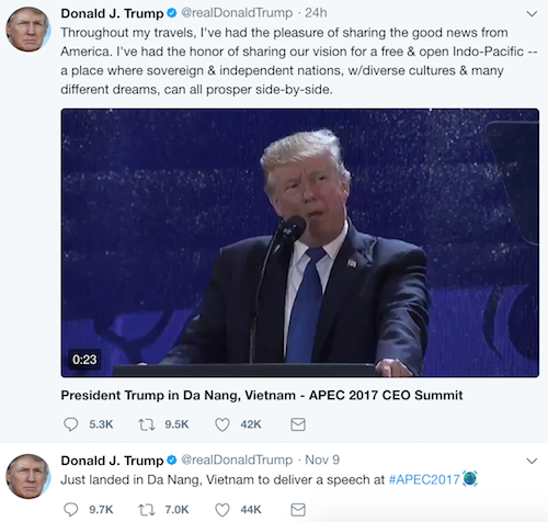 Thông điệp "Thank you #Vietnam!" cùng ảnh vẫy tay chào trước khi bước vào máy bay vừa xuất hiện trên tài khoản Instagram của ông Donald Trump.