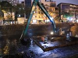 Cùng với việc xây dựng đập dâng, công tác nạo vét bùn thải trên toàn tuyến sông Tô Lịch cũng đang được triển khai mạnh mẽ. Hàng chục công nhân của Công ty TNHH MTV Thoát nước Hà Nội túc trực tại lòng sông để vận hành thiết bị hút bùn cả ngày lẫn đêm.