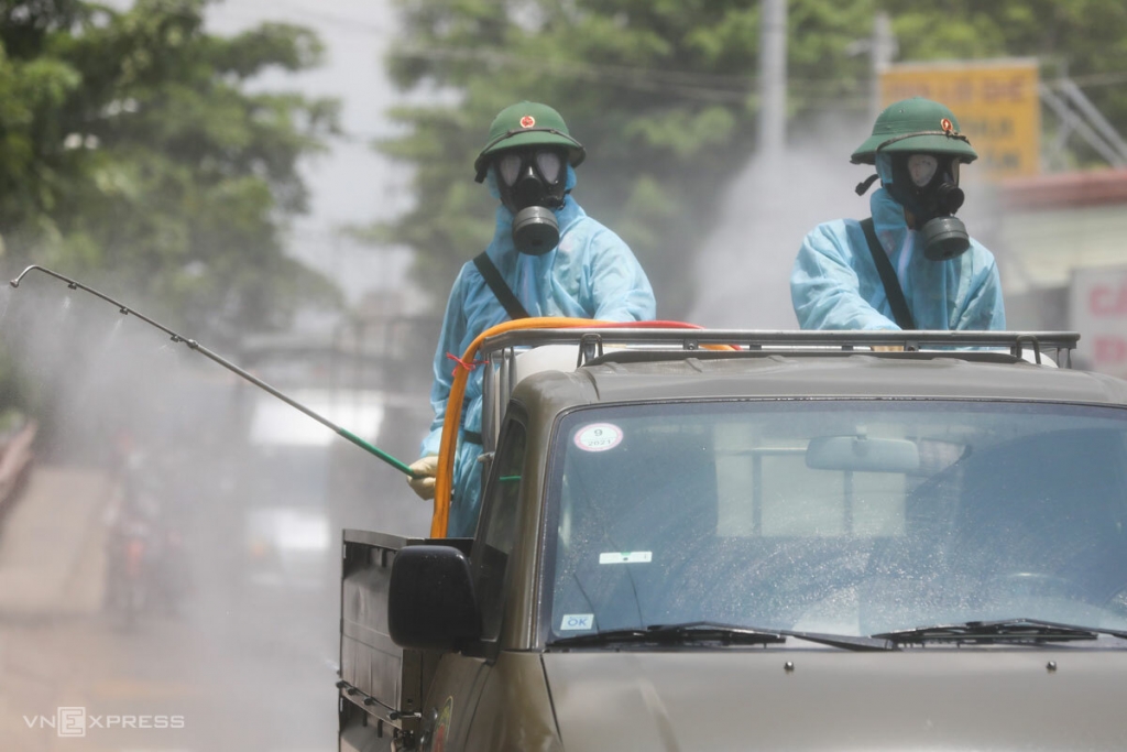 Quân đội phun khử trùng ở Quận 12, TP HCM. Ảnh: Quỳnh Trần |