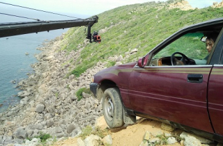 Ở trích đoạn kịch tính nơi vách núi, ê-kíp dùng dây cáp cố định ô tô có diễn viên Khả Ngân bên trong.