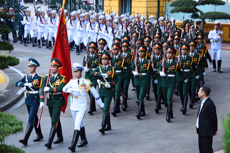 Đoàn Nghi lễ quân đội đón Chủ tịch Triều Tiên Kim Jong-un tại Phủ chủ tịch chiều 1/3. Ảnh: Giang Huy