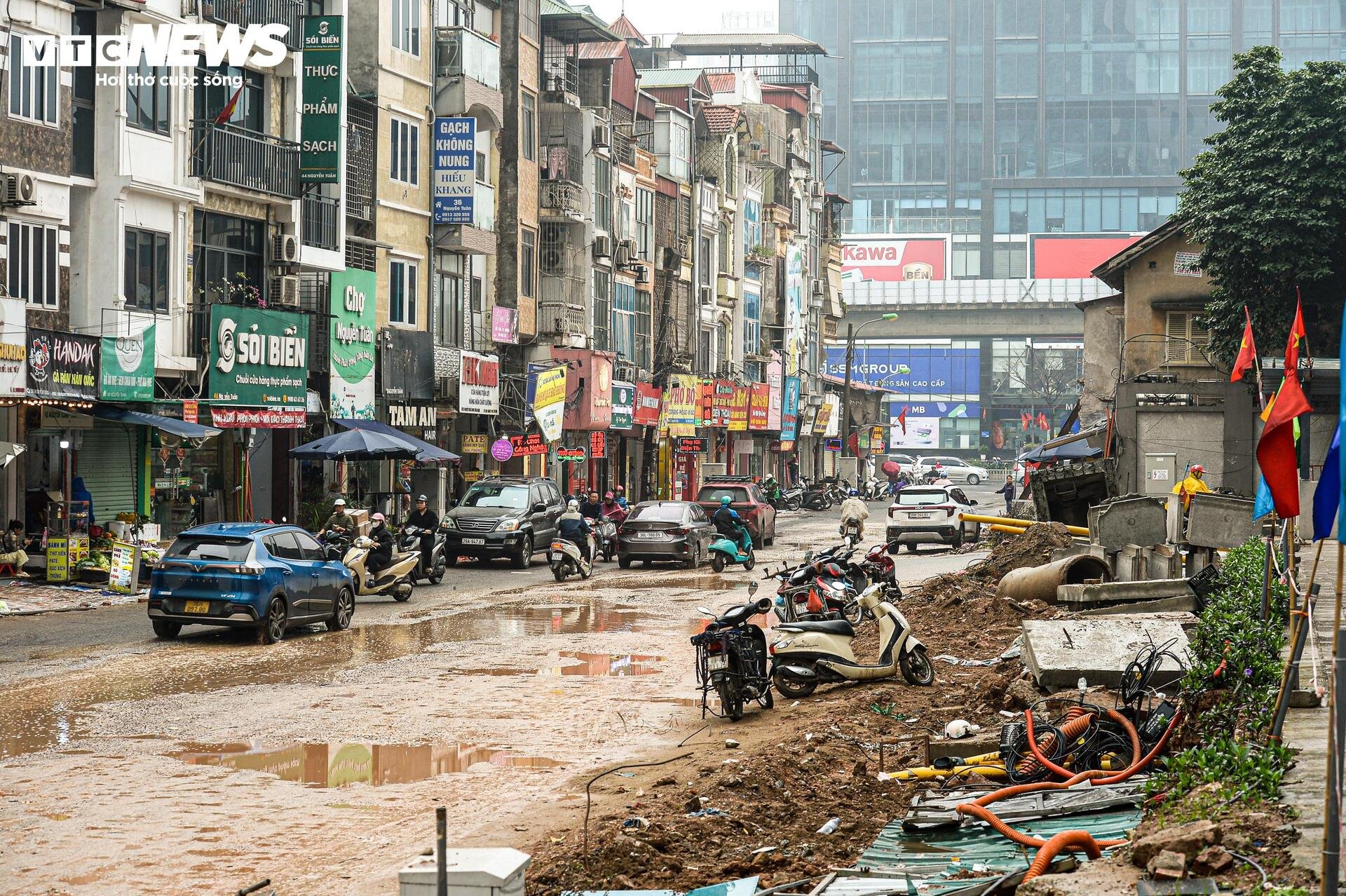 Sau kỳ nghỉ Tết Nguyên đán, tuyến đường Nguyễn Tuân (phường Thanh Xuân, Hà Nội) vẫn trong tình trạng đào xới dang dở. Mưa phùn kéo dài khiến bùn đất từ khu vực thi công loang ra mặt đường, bám kín lối đi, ảnh hưởng trực tiếp đến sinh hoạt và kinh doanh của người dân dọc hai bên tuyến đường.