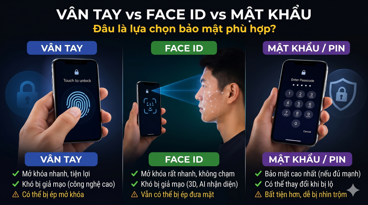 Thay vì lựa chọn một phương thức duy nhất, xu hướng hiện nay là kết hợp nhiều lớp bảo mật để tận dụng ưu điểm của từng công nghệ. Sinh trắc học như vân tay hoặc Face ID có thể đảm nhiệm vai trò mở khóa nhanh trong sử dụng hằng ngày, trong khi mật khẩu hoặc PIN đóng vai trò lớp bảo vệ gốc.