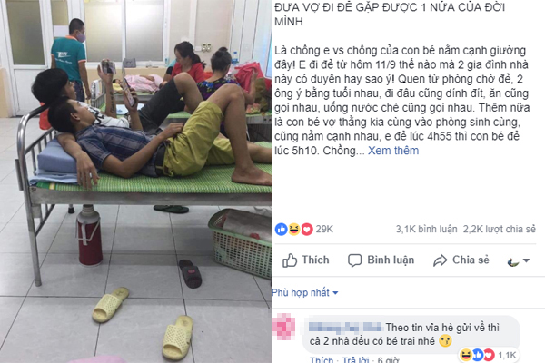 Góp thêm vào hàng tá câu chuyện kể kỷ niệm ngày đi đẻ, thành viên có nick Chu Huyền viết: “Nhà mình và nhà đấy đi đẻ cùng ca, con mình 5h15 con nhà kia 5h30. Mới nhập viện 2 mẹ chồng kiểu gì ngồi hành lang đã quen nhau hẹn nhau cùng về nhà, rồi lại cùng xuống thăm dâu, hẹn nhau ngày ra viện thuê xe chung đón về. Đẻ xong nằm theo dõi cùng nhau, 2 bà vợ nằm vừa đau vừa rét cứ hỏi nhau mấy lão chồng đâu chị nhỉ. Xong xuôi mới biết hôm đó quen nhau 30' rủ nhau đi ăn lẩu đỡ đói vì chờ vợ đẻ chưa ăn gì. Trong lúc vợ nằm cắn răng chịu đau vì vết mổ”.