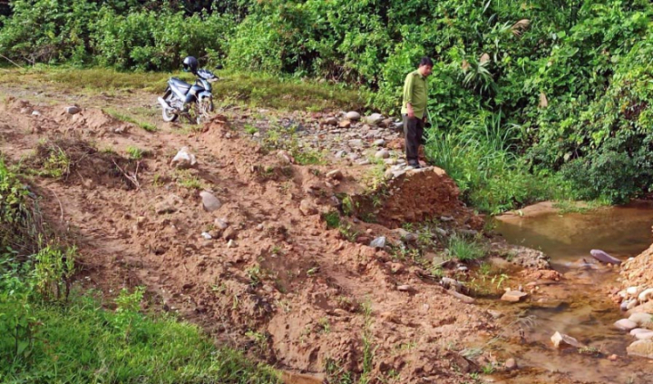 Theo ghi nhận, tại khu vực khe Ao gần Trạm Kiểm lâm Hương Lộc (huyện Nam Đông), tuyến đường tuần rừng bị lũ “xé” từ năm 2020 nay được hoàn trả lại khá sơ sài. Tại khu vực ngầm tràn đã bị lũ cuốn, một số đoạn được đắp lại bằng đất đá cũng tạm bợ. Trước đây, đoạn tuyến này, lực lượng tuần rừng có thể đi lại bằng xe máy nhưng bây giờ rất khó khăn. Cách khu vực này chừng 300m cũng đã xảy ra hiện tượng sạt lở với quả đồi bị nứt phía trên...