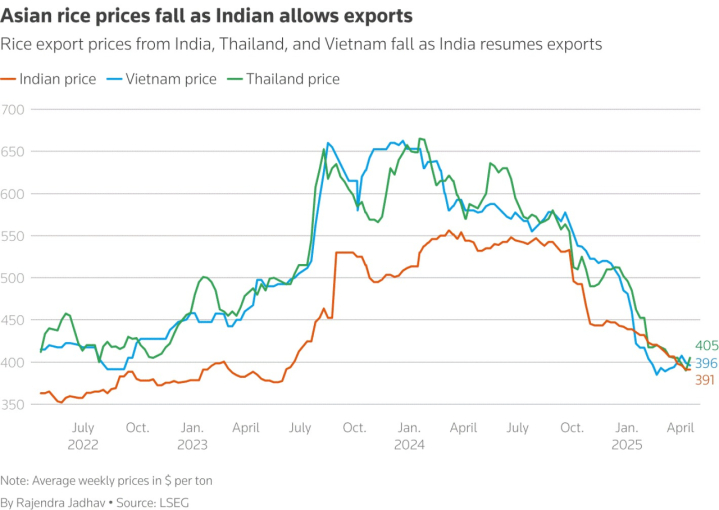 Thị trường gạo đã sụt giảm vào tháng 4, một tháng sau khi Delhi dỡ bỏ lệnh hạn chế xuất khẩu cuối cùng đối với gạo - được áp dụng từ năm 2022, khiến giá xuất khẩu gạo đồ của Ấn Độ xuống mức thấp nhất trong 22 tháng.