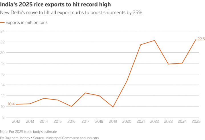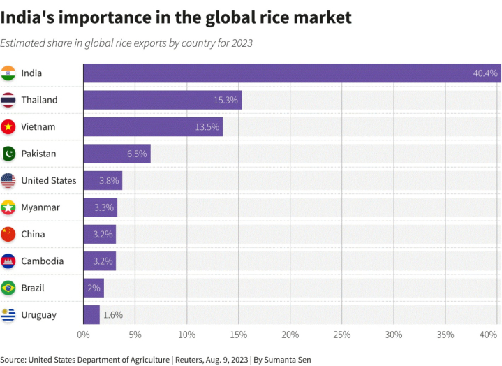 Việc tăng xuất khẩu dự kiến có khả năng đưa Ấn Độ trở lại thị phần thống lĩnh trên thị trường toàn cầu, vốn đã ở mức hơn 40% trước khi nước này hạn chế xuất khẩu vào năm 2022, vượt qua tổng doanh số của bốn nhà cung cấp lớn tiếp theo - Thái Lan, Việt Nam, Pakistan và Mỹ.