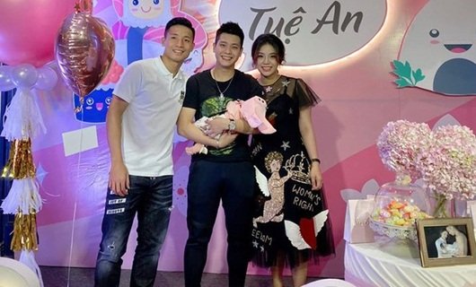 Quân A.P có mối quan hệ thân thiết với gia đình trung vệ Bùi Tiến Dũng nên anh xuất hiện trong tiệc đầy tháng của bé Sushi và khoe "lên chức bố".