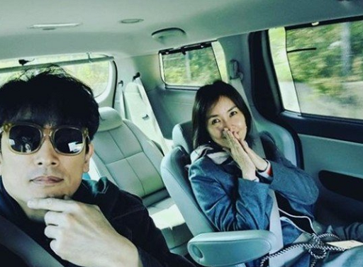 Trên trang cá nhân, diễn viên Hàn Quốc Shin Ae Ra đăng bức ảnh hai vợ chồng bên nhau và viết: 'Cùng chồng đi làm'.
