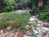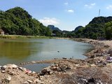 Nhiều cây gỗ đâm xuyên qua lớp đất, đá mọc lên thân bờ kè.