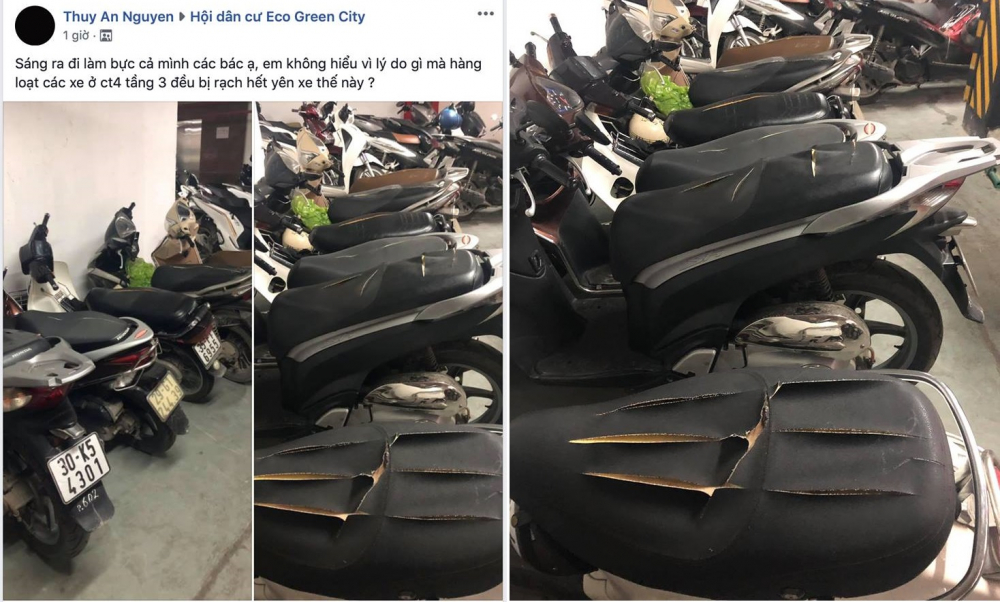 Vào khoảng thời gian trên, lực lượng an ninh của khu chung cư Eco Green City đi tuần tại tầng 3 của tòa nhà CT4 thì phát hiện một số xe máy bị rách nhiều vết trên yên xe.