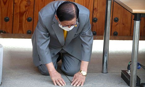 Thủ lĩnh của giáo phái Tân Thiên Địa Lee Man-hee quỳ gối xin lỗi vì làm lây lan Covid-19 và cam kết hỗ trợ chính quyền ngăn chặn dịch.