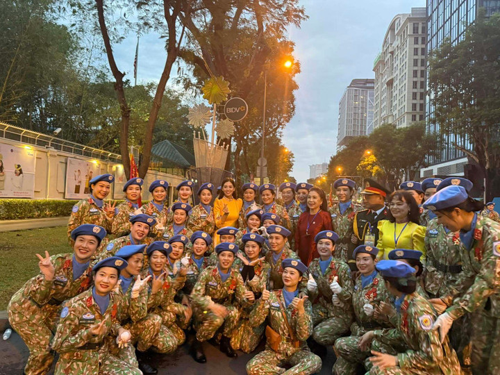 Hoa hậu Việt Nam 2018 Tiểu Vy cũng là những gương mặt nổi bật trong khối văn nghệ sĩ, góp phần làm rạng rỡ đội hình tham gia diễu binh, diễu hành.