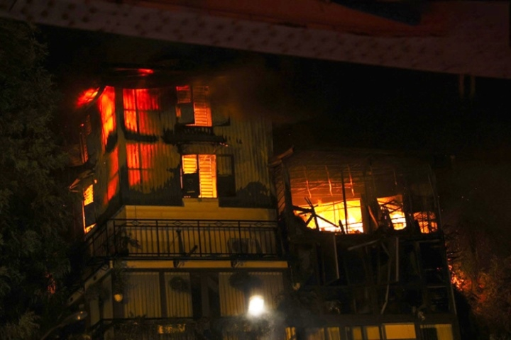 Lửa bùng phát từ tầng tum tại số nhà 15D phố Hàng Cót rồi lan sang các nhà kế bên. (Ảnh: Lê Phú).