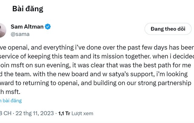 Trong thông báo mới nhất, OpenAI cho biết cựu CEO Sam Altman sẽ quay lại điều hành công ty này sau khi hai bên tìm được tiếng nói chung.