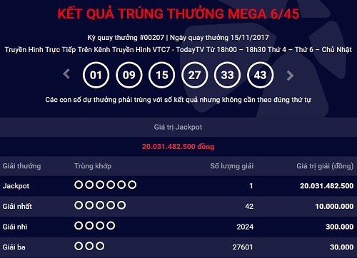 Kỳ quay thưởng thứ 207 của Vietlott xác định một chiếc vé trúng giải Jackpot trị giá hơn 20 tỷ đồng.