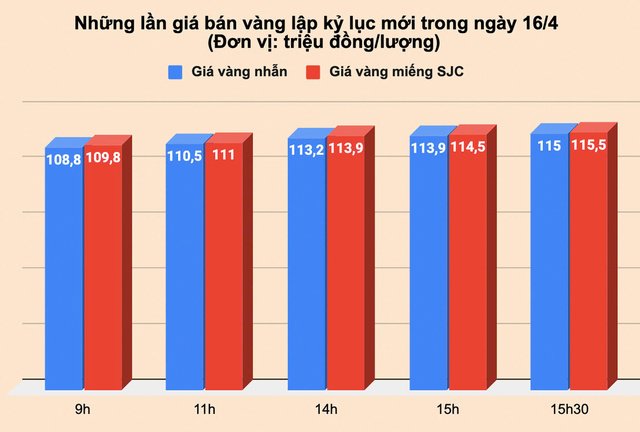 Hôm nay (16/4) là ngày giao dịch khó tin của vàng khi chỉ trong 1 ngày, giá bán ra đã tăng 7,5 triệu đồng/lượng và có tới 5 lần lập đỉnh lịch sử.
